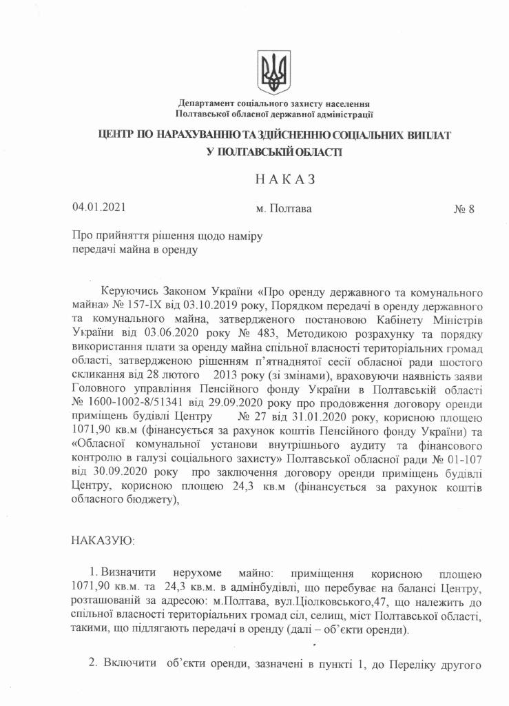 Центр по нарахуванню та здійсненню соціальних виплат у Полтавській області оголошує конкурс на право оренди частини нежитлового приміщення для розміщення торгівельного об'єкта з продажу продовольчих товарів, крім товарів підакцизної групи, загальною площею 3,40 кв.м., за адресою м.Полтава, вул.Ціолковського, 47 зі стартовою орендною платою 95,25 грн. зПДВ/місяць. За додатковою інформацією щодо переліку документів та умов конкурсу звертатиса за адресою: Ціолковського, 47, та за телефоном 68-12-61. Документи приймаються протягом 15 календарних днів після опублікування оголошенняю
